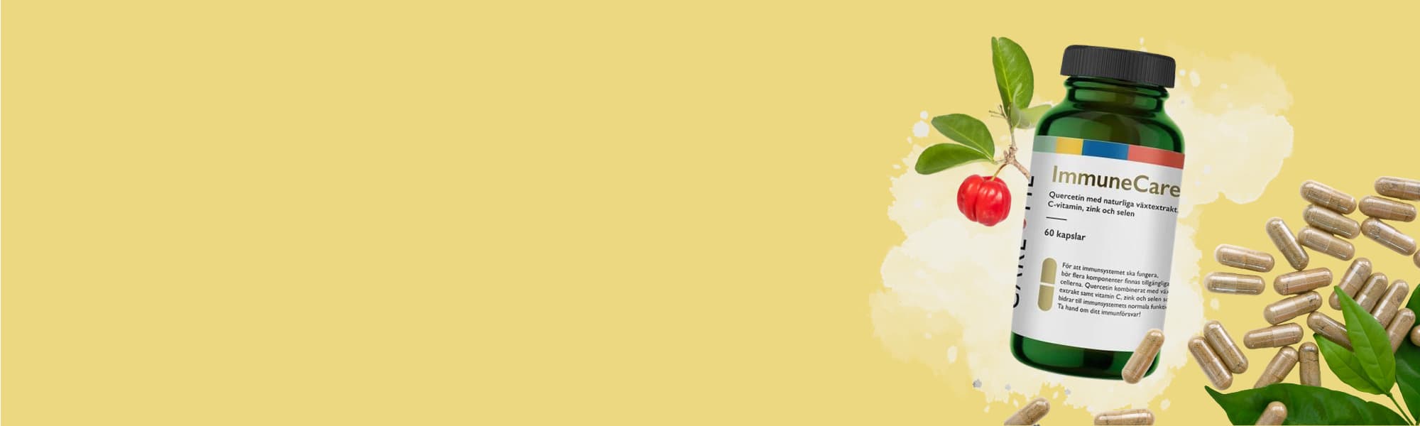- Naturliga ingredienser: ImmuneCare innehåller naturliga växtextrakt som quercetin, acerola, grönt te och bromelain. Alla ingredienser jobbar tillsammans för ditt immunförsvar