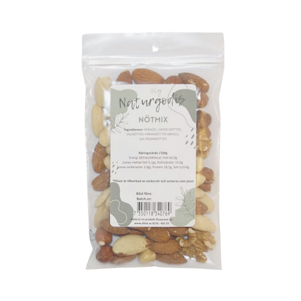 Nötmix Neutral är en blandning av olika nötter som bland annat hasselnötter paranötter, valnötter och pekannötter som är osaltade och naturliga!
