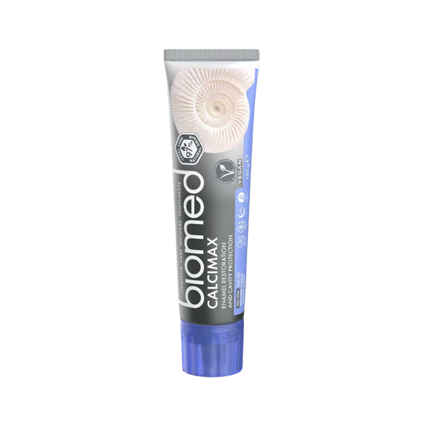 Biomed Calcimax tandkräm är en naturlig tandkräm som är gjord på kalcium, magnesium, zinkhydroxiapatit och L-arginin.