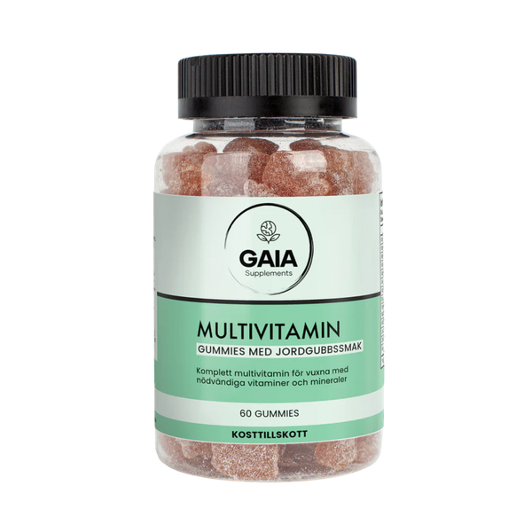 Få i dig alla viktiga vitaminer och mineraler – utan att svälja tabletter. Gaia Supplements Multivitamin Gummies för vuxna kombinerar ett brett spektrum av näringsämnen i en god gummie med naturlig jordgubbssmak. Perfekt för dig som vill stödja din energi, immunförsvar och kroppens dagliga funktioner på ett enkelt och njutbart sätt.