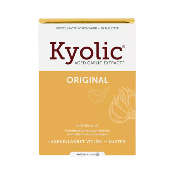 Kyolic Original är ett kosttilskott som består av 30 tabletter varav en tablett innehåller 600 mg. Kosttilskottet hjälper bidra till immunförsvaret och normala kolesterolvärden.