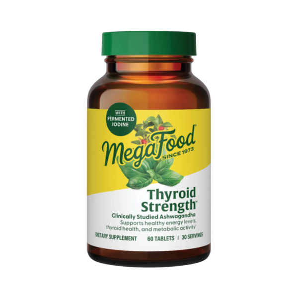 Thyroid Strength från MegaFood är ett kosttillskott baserat på whole food-ingredienser som tillför viktiga mikronäringsämnen för att stödja en normal sköldkörtelfunktion. Formulan innehåller även L-Tyrosin, helig basilika, ashwagandha och forskolin.
