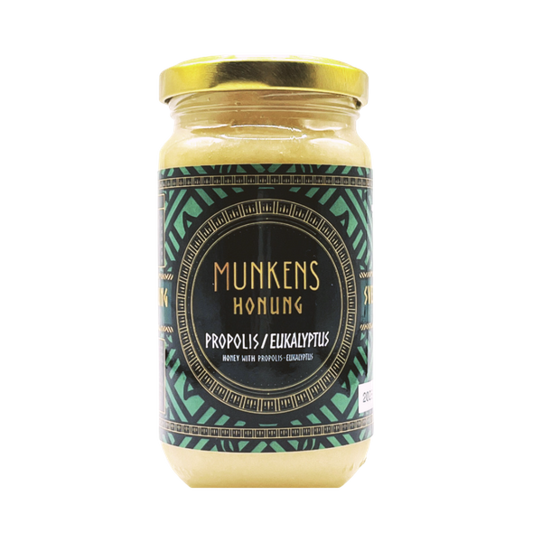 Honung Propolis & Eukalyptus från Munkens är en rå/raw, kallslungad honung som anses ha hälsofrämjande egenskaper. Smaksatt med eukalyptus, pepparmintsolja samt menthol. Honungen kommer från Munkens egna biodlingar i Sverige där bina får fri tillgång till de allra bästa grönområdena.
