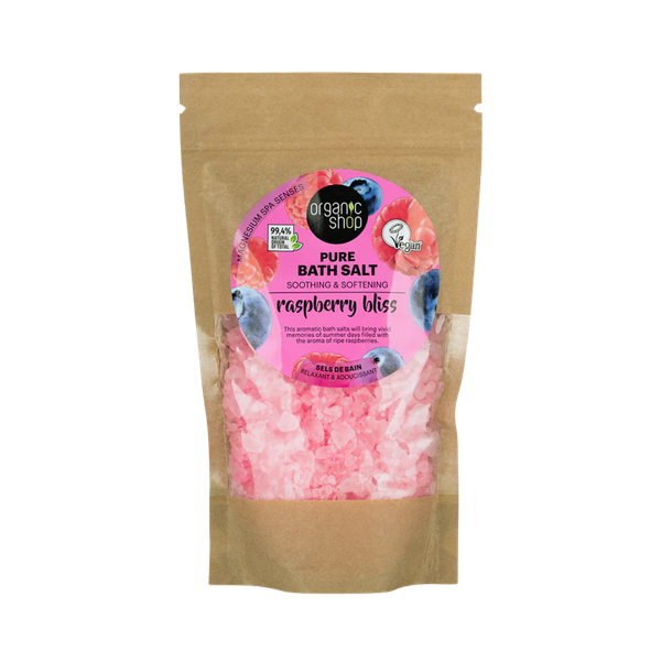 Organic Shop Pure Bath Salt Raspberry Bliss - Ett lyxigt badsalt med ekologiskt hallon och blåbärsextrakt som stärker och vårdar huden på djupet.