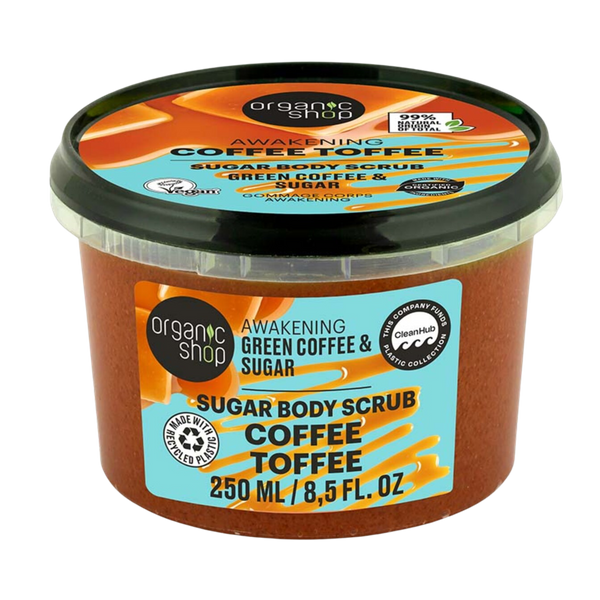 Awakening Coffee Toffee Scrub från Organic Shop är en uppfriskande sockerpeeling berikad med kaffe och kola som varsamt exfolierar huden, ger ny energi, strålande lyster och en härligt mjuk känsla.