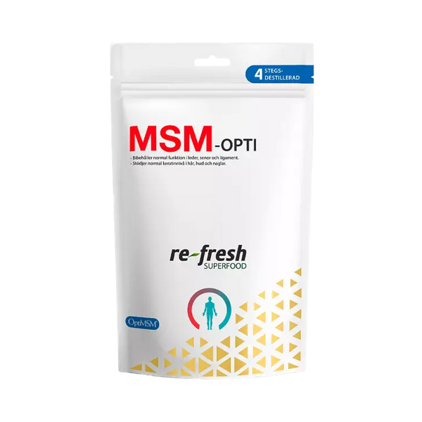MSM-Opti från Re-fresh Superfood innehåller rent, organiskt svavel helt utan tillsatser. Enligt Re-fresh är MSM-Opti världens renaste MSM, tack vare en avancerad destilleringsprocess i flera steg.